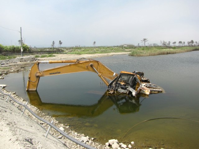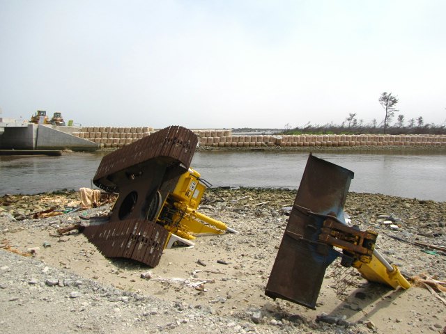反対側にも別の重機がひっくり返ったまま。